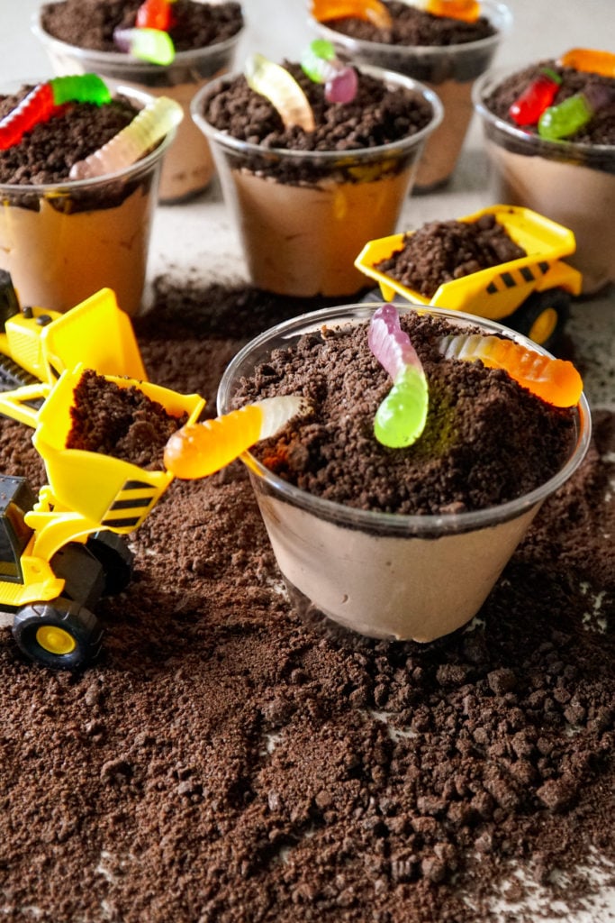 The great thing about this recipe is that it is uses simple ingredients that everyone loves. You start with a chocolate pudding base and add a whipped topping then add crushed Oreo’s with the filling removed and garnish with your favorite gummy worms.