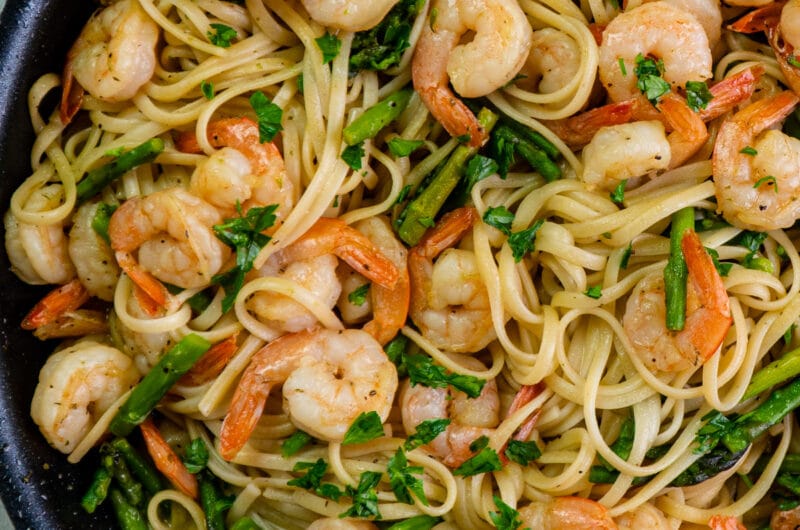 - It combines perfectly seasoned shrimp with buttery pasta and fresh asparagus – yum!